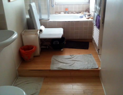2) The second option would be a bath hoist and portable ramp. This would enable transfer into the bath if the person is unable to slide over to the bath lift. This can be used with the wheeled seat to reduce the number of transfers if required. So the person would just be pushed up the ramp on the wheeled seat, and then the seat would be attached to the hoist and the person lifted and lowered into the bath. 3) The third option would be the most disruptive and the most expensive but it would meet all long term needs. In this case, the step cannot be removed the make the bathroom level due to the heating and pipe work under the step. A ramp can be fitted to the area (again portable or a permanent structure could be made.) The shelf area beside the toilet would need to be removed to create more space. The bath would then be taken out and a level access shower (wet room)? fitted. In this instance, the soil stack is behind the old fireplace in the middle of the bathroom which causes some problems. If a permanent ramp was to be fitted, the toilet and basin could no longer be accessed where they are as the ramp would be blocking the access. These would need to be refitted on the shower level. The best way to conserve space here, is to put the toilet in the shower area. When this is not being used as shower, the doors would be folded back and it would just be a toilet. The person can then be wheeled over the toilet on the wheeled commode. The basin would also be relocated onto this level to enable access. |